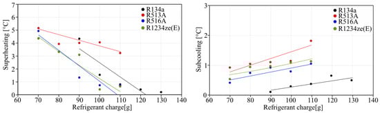 Figure 3. It is expected that the increased charge causes an accumulation of refrigerant in both the evaporator and the condenser. Regarding the degree of superheating, it has been found that the highest superheating is displayed at low refrigerant charges because the evaporator is emptier. In contrast, at higher charges, the evaporator overflows, which lowers the degree of superheating as well as the refrigerant temperature in the suction line. Comparing the refrigerants, it is observed that R513A has the highest degree of superheating. As for the degree of subcooling, this increases slightly with the increasing refrigerant charge, which can also cause a minimal increase in operating pressures. In addition, the cooling capacity of the system can be favored.