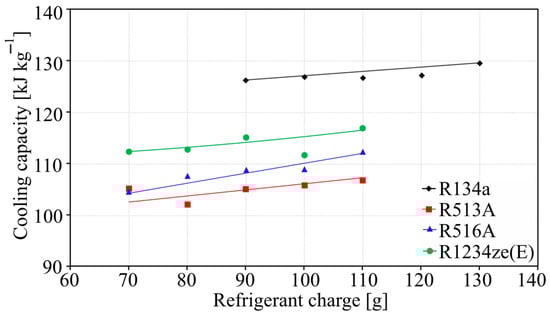 Figure 4, where the cooling capacity of the refrigerator increases as the refrigerant charge increases. This parameter is calculated based on experimental data (pressure and temperature) to estimate the enthalpy values at the inlet and outlet of the evaporator. This calculation considers an average of two compressor operations cycles during the period of thermal stability of the refrigerator. Note that R134a has the highest cooling capacity among the alternative refrigerants, and, in fact, has the largest latent heat favoring heat absorption (as shown in