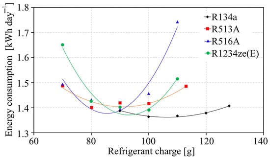 Figure 5 shows the experimental energy consumptions for each charge variation; in addition, there is a curve for each refrigerator that represents a quadratic regression. The minimum degree of correlation is of the 0.94 order and corresponds to the regression of R513A. Therefore, the appropriate charge for each refrigerator is that which corresponds to the minimum energy consumption according to the quadratic regression. Thus,