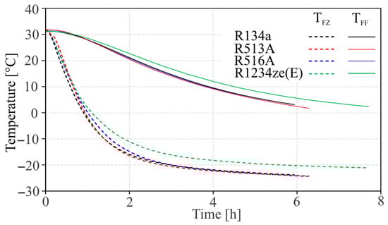 In more detail, the abatement time obtained for refrigerant R134a was 5.94 h, in which a temperature of −23.71 °C was reached in the freezer and a temperature 3.26 °C in the fresh food compartment. The refrigerants R513A and R516A show very similar performances to R134a with an abatement time of 6.29 h and 6.25 h, respectively, with a slight decrease in temperature for both refrigerants, in the freezer of 0.5 °C and 1.2 °C in the fresh food compartment, compared to the values obtained with R134a. For the refrigerator R1234ze(E), the abatement period was 7.71 h, which represents an increase in the operating time of 30% compared to R134a. The temperature of the fresh food compartment for this refrigerant is −21.03 °C and 2.5 °C for the freezer.