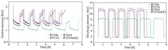 Figure 7. These pressures represent the stable condition of the ON/OFF cycling of the compressor, i.e., the normal operation of the appliance after the first start-up. By a quick inspection of the figure, it can be noted that R1234ze(E) presented a different behavior to other refrigerators. For example, the average suction pressure for R134a was 1.24 bar, while for R1234ze(E) it was about 1.06 bar, representing a 14.5% reduction in suction pressure. As for the refrigerants R513A and R516A, suction pressures very similar to R134a were observed. As for the discharge pressure, R1234ze(E) showed a decrease of about 26% with respect to R134a, while the discharge pressure of the mixtures was very similar and slightly higher than R134a. The behavior presented by the operating pressures of R1234ze(E) with respect to other refrigerants has to do with the lower density that this refrigerant has.