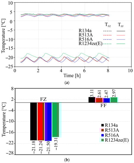 Figure 8a). The variability in the fresh food compartment was minimal between the alternative refrigerants with respect to R134a, while for the freezer, the refrigerant R1234ze(E) had a higher temperature than the rest of the refrigerants, which is reflected in