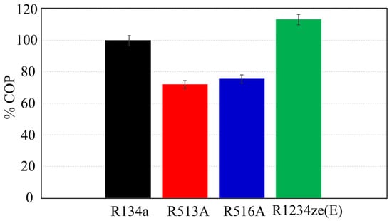 Figure 9 shows the comparative COP between the different refrigerants evaluated, assuming that R134a represents 100%, i.e., the figure reflects the percentage variation of the COP of refrigerants R513A, R516A, and R1234ze(E) with respect to R134a as a reference. R513A and R516A showed a reduction of 28% and 25%, respectively, while R1234ze(E) showed an increase in COP of 13% compared to R134a. These variations in COP were mainly due to the reduction in the refrigerator’s cooling capacity. Although R1234ze(E) has a lower cooling capacity, it also has a lower energy consumption, which is reflected in the increase in COP, showing this refrigerant as a viable option from the energy point-of-view, as well as thermal to replace R134a. The same case as that reported in [