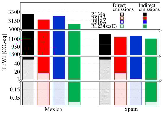 Figure 10 shows the contribution of the combined impact of the refrigerator, noting that direct emissions are minimal compared to indirect emissions by type and energy consumption. It was also noted that the situation of the refrigerator in Mexico reflects a higher TEWI value than in Spain; this is largely marked by the type of power generation between the two countries. Therefore, the use of these alternative refrigerants in domestic refrigeration would be more advisable in Spain, specifically R1234ze(E) and R516A. Refrigerants R134a and R516A have a practically similar combined impact, and this is because the R516A presented the highest energy consumption among the alternative refrigerants of 505.89 kWh per year, 3% below the consumption of R134a. R1234ze(E) is the refrigerator that presents lower impacts, reflecting a reduction of 6% compared to R134a.