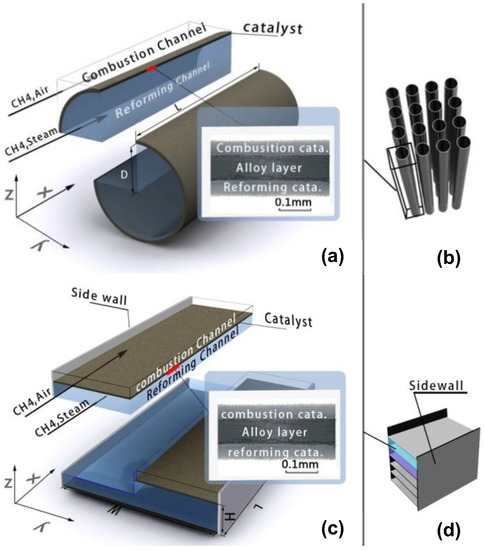 Figure 1 shows a schematic diagram of the tube-type and box-type SRM reformer cells. In a tube-type or box-type reformer, the anodic alumina catalyst was formed into a tube or plate shape, respectively. The inner and outer layers of the sandwich structure of the anodic alumina catalyst were prepared to produce the SRM catalyst and methane combustion, respectively. The SRM reaction took place inside the tube-type reformer channel or inside the box-type reformer channel, while the methane combustion reaction took place outside. The plate-type catalyst itself was used to separate the different channels. The reactants of the combustion reaction and the reactants of the SRM reaction were introduced in a co-current mode. The co-current mode allowed for a self-sustaining operation in a wider range of flow regimes than the counterflow mode [22]. The reaction conditions and catalyst parameters are listed in Table 1. It is worth noting that no anodic alumina catalyst was placed on either side of the box channel.