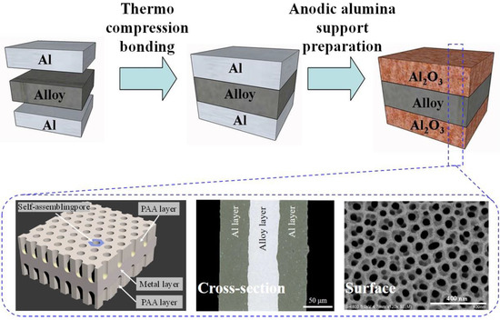 The Al/Fe-Cr alloy/Al-clad substrate is a composite material with a sandwich structure of two layers of aluminum and one layer of alloy made by a thermal compression bonding technique (Figure 3). The clad substrate is heat treated at 550 °C for 12 h before anodizing. Our previous research [37] has shown that during heat treatment, a transition alloy layer of several microns forms between the Al and alloy layers due to element diffusion. It is this transition alloy layer that imparts a highly stable adhesion to the anodic alumina layer obtained by anodizing the clad substrate.