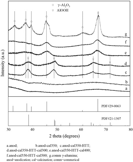 Figure 4 shows the XRD patterns of the PAA materials with different post-treatments. The skeletal alumina obtained after anodization was amorphous alumina (sample a), and calcination at 350 °C did not change its crystal structure (sample b). The diffraction peaks of the HTT-treated sample (sample c) were attributed to boehmite (AlOOH, PDF# 21-1307). That is, the hydrated alumina produced by the hydrothermal treatment was boehmite (AlOOH). The HTT-treated sample retained the AlOOH crystal structure after further calcination at 300 °C (sample d). When the calcination temperature after HTT reached 400 °C or higher, two broad peaks attributable to γ-alumina [16] were clearly detected near 45° and 67° (PDF# 29-0063). This indicated that AlOOH underwent a phase change to form r-alumina during calcination.
