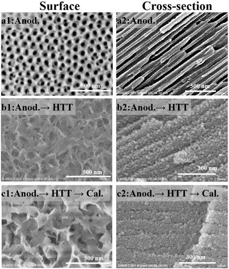 Hydrothermal treatment (HTT) of anodic alumina is one of the more classic techniques in areas such as corrosion protection and coloring of metals, with applications ranging from window frames to electronics (e.g., coloring the metal case of an iPhone). When PAA materials are subjected to steam, hot water, or metal salt solutions, the skeletal alumina reacts with water to form hydrated alumina, accompanied by volume expansion. Hence, the hydrothermal treatment is often referred to as a pore-sealing treatment. In this study, hydrothermal treatment was used as a means to change the phase state of the skeletal alumina in PAA materials. To avoid strong pore sealing, a mild HTT condition was adopted, i.e., soaking in hot water at 85 °C for 2 h. The anodization conditions of the samples used were as follows: 4% oxalic acid (20 °C) for 8 h under a current density of 50 A/m2.