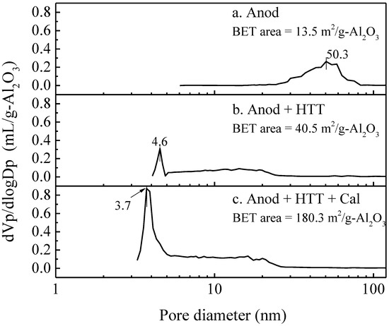 As is shown in Figure 5, the dense aluminum layer on the surface of the clad material was transformed into a porous alumina layer after anodization (Figure 5(a1)). These pores were parallel to each other and had a diameter of approximately 50 nm (Figure 5(a2) and Figure 6a). After the HTT treatment, the hydrated alumina generated by the reaction of amorphous alumina with hot water adhered to the main pore skeleton derived from anodization, and the smooth main pore walls became rough (Figure 5(b2)). Furthermore, a large number of fish-scale protrusions appeared on the sample surface (Figure 5(b1)). Since the reaction of amorphous alumina with water to form hydrated alumina is accompanied by volume expansion, the diameter of the main pore resulting from the HTT treatment shrank significantly. However, the swollen hydrated alumina did not completely block the main pore structure, and the main pore could still be clearly observed on the surface and cross-section of the PAA sample (Figure 5(b1,b2)). The BET results showed that the average pore size of the HTT-treated PAA layer decreased from 50 nm to 4.6 nm, and the specific surface area increased from 13 m2/g to 40 m2/g (Figure 6b). After the next calcination at 500 °C, the surface (Figure 5(c1)) and cross-section (Figure 5(c2)) of the sample were similar to those of the uncalcined sample. However, the roughness of the pore walls and the fish-scale protrusions on the surface were reduced. Meanwhile, as is shown in Figure 6c, the pore size distribution showed that a large number of pores of approximately 3.7 nm appeared after calcination, leading to a significant increase in the specific surface area to 180 m2/g. Combining the SEM and XRD results, we considered that the hydrated alumina attached to the main pore wall lost its bound water during calcination and was converted to γ-alumina. In addition, numerous fine pores appeared at the locations where the bound water was lost.