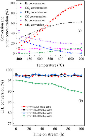 A plate-type anodic alumina-supported Ni catalyst (18 wt.% Ni loading) was synthesized via a double impregnation method using the as-prepared anodic alumina support. The anodic alumina catalyst was used for the SRM activity test and the result is shown in Figure 7a. The methane conversion was close to the thermodynamic equilibrium data when the temperature exceeded 450 °C, indicating the excellent activity of the catalyst. The deviations from the equilibrium data below 400 °C could be attributed to the lower reaction temperature. Similar to the methane conversion, the concentrations of each reactant (on a dry gas basis) were in general agreement with the thermodynamic equilibrium data. Among them, the CO2 concentration showed a trend of increasing and then decreasing, confirming the presence of both the SRM reaction and the water–gas shift reaction in this reaction system. The presence of more than 98% of the C element equilibrium indicated that it was reasonable to consider only the SRM reaction and the water–gas shift reaction in the current reaction system. Moreover, as is shown in Figure 7b, no catalyst deactivation was observed within 100 h when the catalyst was subjected to a durability test at 700 °C (F/w from 50,000 mL/g-cat/h to 300,000 mL/g-cat/h) for 100 h. Therefore, it is acceptable to consider the system as a steady-state operation. within this F/w range. However, in experimental tests, when the space velocity was further increased to 400,000 mL/g-cat/h, the catalyst started to deactivate gradually. This catalyst deactivation may have been related to an excessive inlet velocity, and the exact cause of this is being resolved.
