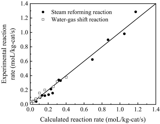 When testing the kinetics data of the anodic alumina catalyst, the catalytic layer was scraped from the plate catalyst into the powder state to avoid the effect of concentration gradients. Figure 8 shows the comparison of experimental and calculated values of the SRM reaction rate and the water–gas transfer reaction rate on the anodic alumina catalyst. The calculated values of these two reaction rates were in good agreement with the experimental results, which means that the obtained rate parameters shown in Table 2 are quite reliable.