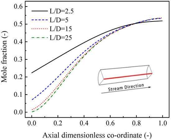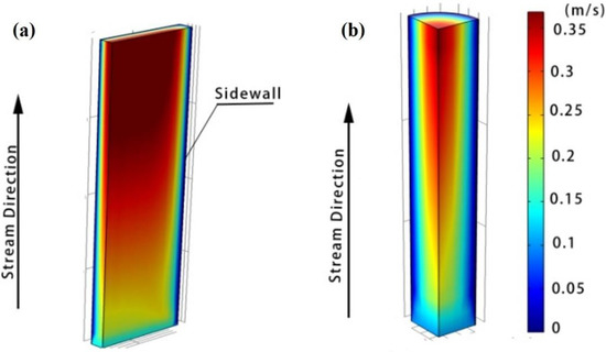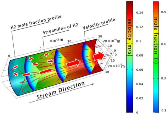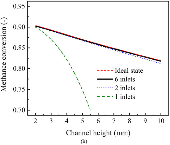 In our 3D model, the effects of the two sidewalls of the box channel were taken into account. As is shown in Figure 9, the boundary effect of the sidewalls in the box-type reformer was obvious (especially when the channel width was small), resulting in an inhomogeneous velocity distribution along the y-axis. In contrast, in the relevant literature using the 2D model, it is generally assumed that the velocity along the y-axis is homogeneous since the 2D model has only a two-dimensional (x, z) velocity distribution. This obviously does not correspond with the real situation. Comparatively, the tube-type channel is ideal compared to the box-type channel.