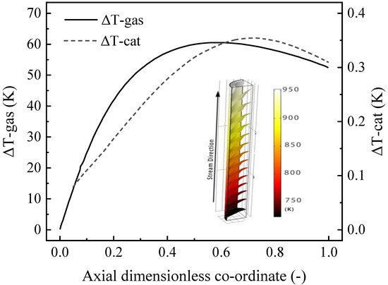 Figure 10 shows the temperature distribution in the tube-type channel (diameter of 15 mm and length of 15 cm). The transverse temperature difference curve along the length of the reforming channel shows that the maximum temperature difference between the combustion catalyst (using the temperature data in Figure 2) and the reforming catalyst (ΔT-cat.) was less than 0.5 K. In contrast, the temperature difference between the reforming catalyst and the gas phase center (ΔT-gas) was less than 70 K. The literature [29] reported that in a conventional tubular reforming channel filled with catalyst pellets, the temperature difference between the tube wall and the gas phase center was approximately 250 K. The ΔT-gas, in the case of thin-walled catalysts, was only 30% that of pellet catalysts, indicating the potential advantages of CPR reactors in terms of heat transfer and energy savings. Similar results were observed for the box reformer and will not be repeated here.