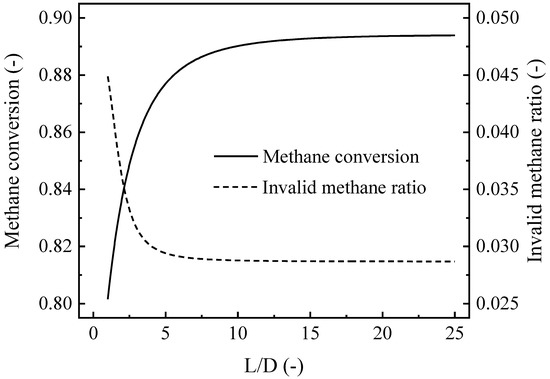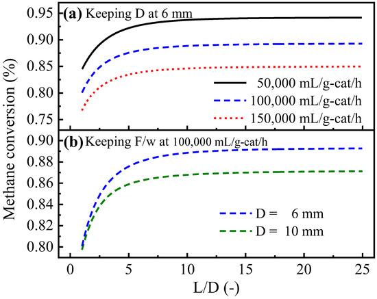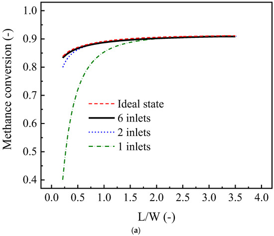 The performance of plate-type CPR reformers is closely related to the design of the channels. In this study, the L/D (ratio of the length to the diameter of the channel, for tube-type reformers) or the L/W (ratio of the length to the width of the channel, for box-type reformers) was used as one of the main parameters to describe the channel shape. In the simulation cases, the influences of the L/D (Figure 11a) or L/W (Figure 11c) at different space velocities F/w were investigated by adjusting the channel length. The channel diameter D was kept at 6 mm for the tube-type channel (or 2 cm for the box-type channel). In addition, Figure 11b shows the effects of the L/D at different channel diameters of the tube-type channel, and Figure 11d shows the effects of the L/W at different channel heights of the box-type channel.