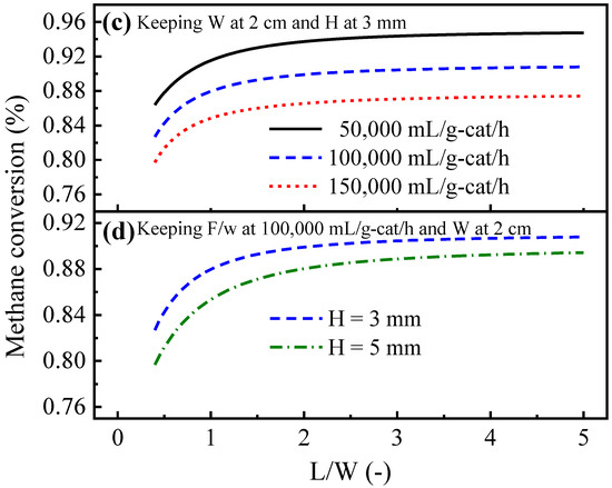 Methane conversion of different types of reformer channels with a different L/D (for tube-type) or L/W (for box-type) under different conditions (a): tube-type, D = 6 mm; (b): tube-type, F/w = 100,000 mL/g-cat/h; (c): box-type, H = 3 mm and W = 2 cm; (d): box-type, F/w = 100,000 mL/g-cat/h and W = 2 cm).