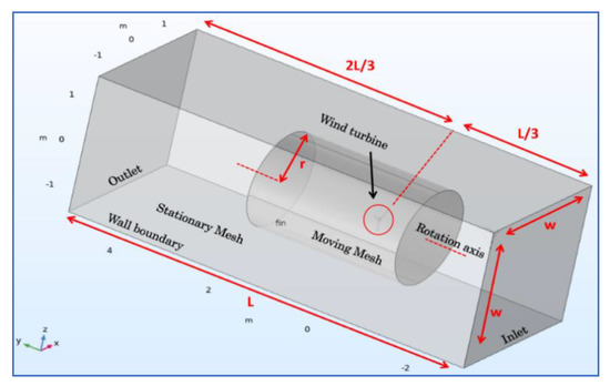 The constructed computational domain is composed of two regions: an outside rectangular region with relatively coarser stationary mesh; and an inside cylindrical moving mesh, with finer elements as the distance towards the rotating turbine decreases. A boundary layer mesh is constructed near the turbine surface to better capture the flow details near the rotating turbine boundary, and free tetrahedra are used as meshing elements for the remainder of the computational domain. In analyses studying the flow behavior around a rotating geometry or turbomachinery, the integration of a moving mesh is paramount to best mimic the motion of the rotating structure. To this end, the cylindrical moving region is translationally fixed and rotates around the designated rotational axis, as does the turbine. Since this aforementioned region is characterized by denser mesh, the larger its volume within the whole computational domain, the larger the number of elements of the entire mesh, and, consequently, the lengthier the solution time gets. Therefore, the dimensions of the moving mesh region must be carefully selected to simultaneously ensure a good wake visualization and overall computational time while maintaining a reasonable computational time. Furthermore, practical considerations should be taken into account for the selection of the dimensions of the computational domain’s outer region as well. The outer region is long enough in the streamwise direction to ensure smooth exit of the vortices through the outflow boundary. Figure 4 shows the developed computational domain and Table 4 provides insights into the selected dimensions. It should be mentioned that a turbulence length scale Lt_scale of 0.1 and a turbulence intensity It of 10% are used for the conducted simulations.