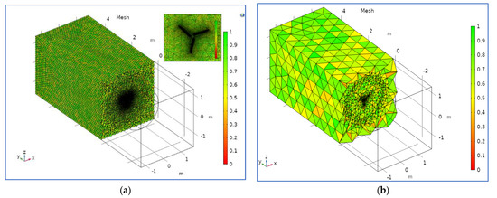 Additionally, Figure 5 shows the meshed computational domain for both meshes 1 and 4, of which the overall number of elements is approximately and , respectively. The legend represents the element quality, where a mesh element is colored green if its corresponding quality is good. On the other hand, yellow and orange elements have compromised-to-poor quality. The quality of mesh elements in COMSOL is measured through the skewness level. In other words, the more skewed an element becomes, the less its quality. Inverted elements are elements with very low quality. A high element aspect ratio is also considered detrimental to the mesh quality; therefore, a maximum threshold of three is set. These should be avoided since they cause high condition numbers for the Jacobians, which, in turn, leads to convergence complications. A ‘perfect’ element has a quality of one. It should also be mentioned that an automatic wall treatment that is associated with the low Re k-ε turbulence model was used. This CFD feature ensures an automatic selection of a robust wall function or a low Reynolds number formulation, which resolves the velocity profile all the way to the wall. Additionally, it is clear that mesh density is remarkably different between the stationary domain and the rotating domain near the turbine; for that, the creation of the mesh was first calibrated for fluid dynamics with a finer, predefined mesh type. Then the element size parameters comprising the maximum element size, the minimum element size, and the maximum element growth rate are adjusted in the rotating domain, which is ~6–8 times denser than the stationary domain.
