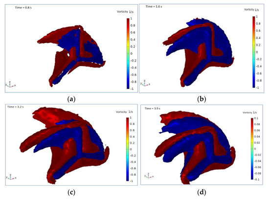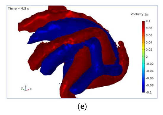 Time frames depicting the formation of the near-wake helical vortex pair structure in the downstream of the rotating turbine at (a) t = 0.8 s; (b) t = 1.6 s; (c) t = 3.2 s; (d) t = 3.9 s; (e) t = 4.3 s.