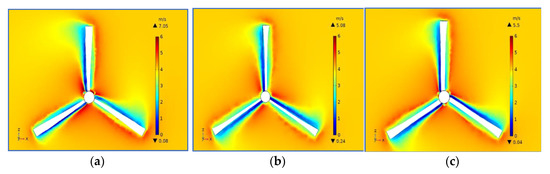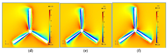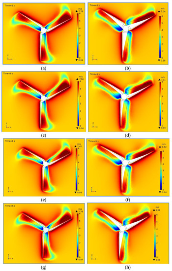 In order to have more insights into the effect of blade shape on flow behavior, x-z cut plots of the flow velocity around the turbine are generated and illustrated in Figure 8. A uniform legend is used, with a display of the maximum and minimum velocity values, depicted by the up- and down-facing arrows; details about the turbines’ geometric characterictics are stated in Figure 1 and Table 1. The flow tendencies and velocity magnitude distributions around the geomery suggest that higher flow velocity magnitudes lie near the rotating tip, while lower velocity magnitudes are close to the hub. Furthermore, the results show that, when a freestream velocity of is used, the flow relative velocity values are constanty higher than the freestream flow velocity value. This is because the obtained relative velocity profile is a result of the freestream velocity in addition to the acceleration of the flow due to the rotating motion. Mathematically, it is given as: