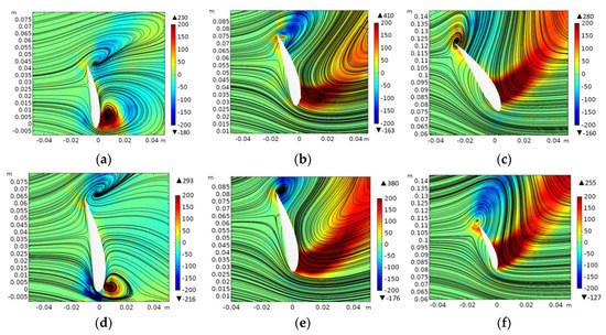 Velocity profiles of the flow surrounding the rotating turbine for (a) Fit A, (b) Fit B, (c) Fit C, (d) Fit D, (e) Fit E, and (f) Fit F.