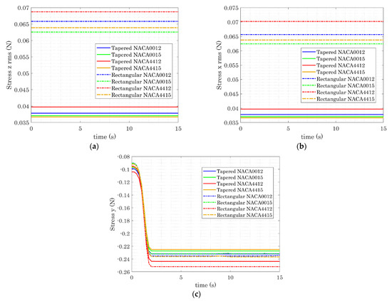 The x, y, and z local distributed stresses that a single SSWT blade is subject to are, therefore, computed and depicted in Figure 11. Their values are obtained by performing a surface integration of the flow force loadings around the overall surface of a single blade. They are a direct result of the aerodynamic loads that the turbine blade is subject to. Consequently, blades with extremely high resulting stress values are more likely to be susceptible to structural wearing out and deterioration. It should be mentioned that since the computational domain is symmetrical with respect to the y-axis, which is the rotational axis, the obtained root mean square (rms) values of the x and z stress values are very similar. The results show that tapered blades faced less stress load magnitudes than their rectangular counterparts. In fact, decreases of approximately 42.21% in the case of NACA4412, 42.49% for NACA4415, 40.64% when NACA0015 is considered, and 42.49% in the case of NACA0012 for both x and z stresses take place when the blade shape is changed from rectangular to tapered with identical overall surface area. Similarly in the y direction, rectangular blade shapes continue to yield higher stress magnitudes for all the airfoil profiles.