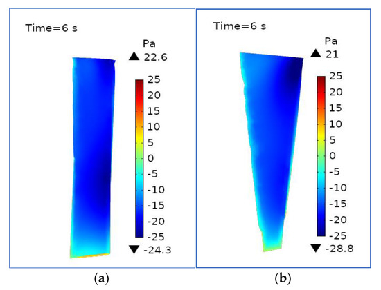 In order to understand the reason behind the tapered blades resulting in overall less stress magnitudes compared to the rectangular blade shapes, the pressure distribution is also investigated using identical flow conditions, which are shown in Figure 12 for both the rectangular and tapered shape consigurations when the NACA4412 airfoil profile is considered. In view of the fact that pressure is a function depending on flow velocity, the blade portions lying near the hub have low pressure magnitudes. Conversly, moving further away from the hub, the values of the pressure increase, attaining the highest value at the turbine blade tip. The negative and positive pressure distributions generated on the suction and pressure sides of the blades, respectively, are tabulated. One can see that, near the blade tip, the air is characterized by a faster motion, resulting in higher pressure magnitudes for both tapered and rectangular configurations. However, the large stress values specific to the rectangular configuration case can be explained by the fact that maintaining the same chord along the blade span results in a larger surface area exposed to higher pressure magnitudes at the tip. On the other hand, for the tapered blade case, the chord length is decreased, resulting in a smaller surface area at the tip region compared to the hub. Consequently, the area exposed to high pressure magnitudes on the tip side is decreased in the case of the tapered blade, which automatically results in less stress magnitudes overall. Additionally, it can be seen that in the case of the tapered blade configuration, the higest positive pressure magnitude lies at the tip region, while the highest suction pressure magnitude is recorded near the hub. However, for the rectangular blade shape, an additional high magnitude region also lies mid-blade for the suction side, as can be seen in Figure 12a.