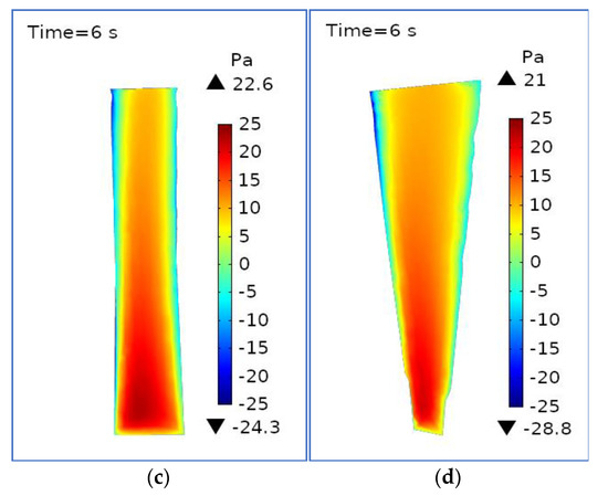 Negative suction pressure and positive pressure distributions for (a,c) rectangular blades and (b,d) tapered blade configurations.