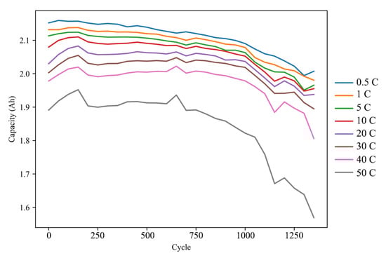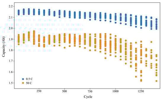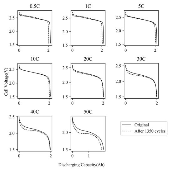 It is evident that the available capacity at high currents experiences a more rapid fade. A two-stage fading process is also observable. The rate of capacity degradation significantly increases after approximately 700 cycles. This number is half of the result obtained by Hang et al. (1500 cycles) [13] and is close to the results reported by Han et al. (450 to 810 cycles) [15]. The location of the inflection point is dependent on the quantity of the positive and negative electrode materials as well as the specific experimental conditions. Considering that our experiment was conducted under similar conditions as the latter, at 55 °C and with a much higher current rate, it is reasonable to assume this conclusion holds. Furthermore, it is apparent that the inconsistency among all cells amplifies during the aging cycles, which is particularly significant in the case of high-rate discharge.