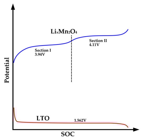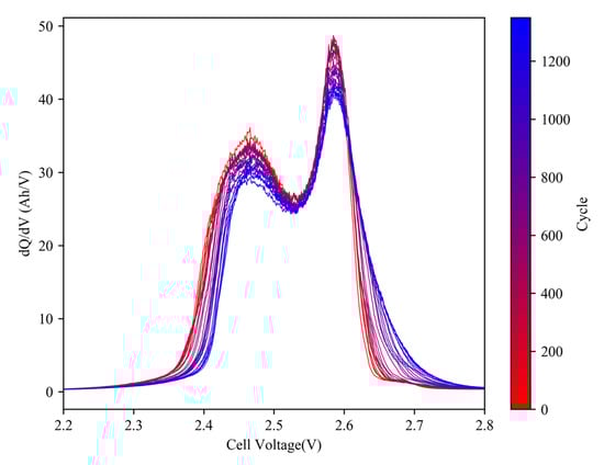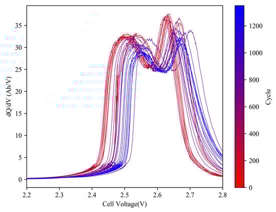 The peaks in the IC curve represent the locations of phase equilibria in the electrode material [23]. In the case of lithium titanate batteries, the LTO anode undergoes a two-phase transformation (Li4Ti5O12/Li7Ti5O12) during lithium-ion extraction or insertion, which occurs at a voltage plateau of approximately 1.562 V vs. Li/Li+ [3]. This LTO anode provides a reference potential for the cathode reaction. As shown in Figure 5, the potential of the LTO anode remains largely unchanged until it reaches a higher state of charge (SOC). At the end of charging, the potential of the LTO anode decreases rapidly, resulting in a rapid increase in cell voltage. The LTO material is generally considered to remain unchanged after aging cycles [24], and therefore, the IC curve of LTO cells is primarily determined by the cathode reaction. In the case of LMO, specifically LixMn2O4, it exhibits two potential plateaus at 4.110 V and 3.94 V versus Li/Li+. As a consequence, the IC curve of the cell displays two peaks at approximately 2.5 V and 2.6 V.