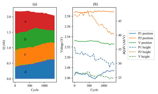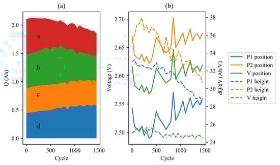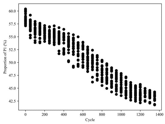 Figure 9 illustrates the proportion of the area occupied by the P1 region of the IC curves for all cells throughout aging cycles. The results indicate a gradual decrease in the P1 area proportion from 57–60% to below 45%. Notably, this decline exhibits a two-stage pattern, with an accelerated rate of decrease observed after 600 cycles, resembling the capacity fading process.