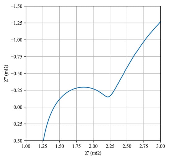 EIS is a useful technique for accurately quantifying each electrochemical parameter of a Li-ion cell without causing any damage to the cell. It is widely believed that the impedance spectra of a Li-ion cell exhibit a small semicircle attributed to the anode at high frequency, a large semicircle attributed to the cathode at intermediate frequency, and a diffusion-related impedance response at low frequency. In the case of LTO batteries, two semicircles can be observed at low temperatures (0 °C or lower) [13]. However, at room temperature, the two semicircles merge and cannot be distinguished, as the time constants of the two internal processes become similar, as shown in Figure 12.