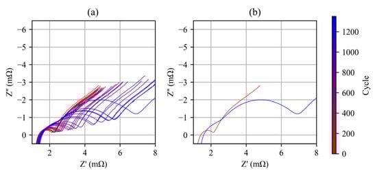 Figure 15 shows the ohmic resistance and eigenfrequency evolution of all cells during aging process. It can be observed that the eigenfrequency of all cells underwent similar changes, stabilizing at 40 Hz before gradually decreasing to 5 Hz and then plateauing. The ohmic resistance exhibited a steady increase, with most cells showing an increase from around 1.5 mΩ to 1.8 mΩ, while some cells showed a maximum increase up to 3.6 mΩ. For most cells, the most prominent aging features were the rapidly decreasing eigenfrequency and the increasing charge transfer resistance, which can be inferred from the enlarged middle-frequency semicircle.
