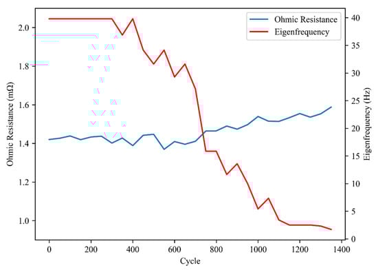 Changes of ohmic resistance and eigenfrequency of cell #7 during aging cycles.
