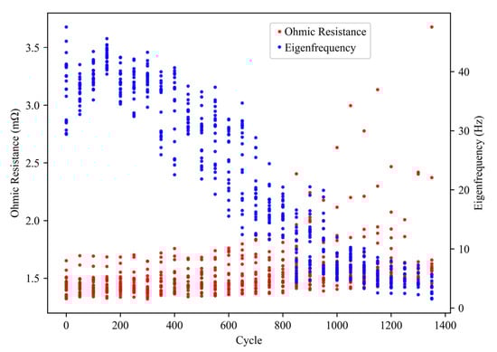 Changes of ohmic resistance and eigenfrequency of all cells during aging cycles.