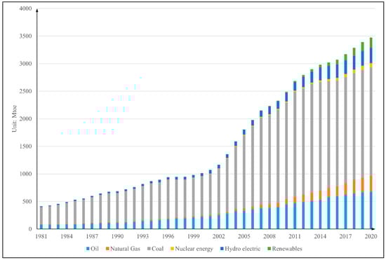 This study utilizes annual data from the period 1981 to 2020 in China. The time series data for population and real GDP were obtained from the World Development Indicators (WDI) online database (https://databank.worldbank.org/source/world-development-indicators, accessed on 30 May 2022), and data for carbon dioxide emissions, oil, natural gas, coal, nuclear, hydropower, and renewable energy consumption were sourced from the British Petroleum Statistical Review (https://www.bp.com/en/global/corporate/energy-economics/statistical-review-of-world-energy.html, accessed on 3 June 2022). Figure 1 depicts the consumption of the six forms of energy in China from 1981 to 2020, indicating a substantial growth for all types of energy. Particularly, nuclear, hydropower, and renewable energy have experienced remarkable expansion during the past 10 years, with their usage share continuously increasing. This research combines nuclear, hydro, and renewable energy as alternative energy, while coal, oil, and natural gas are collected as fossil fuels.