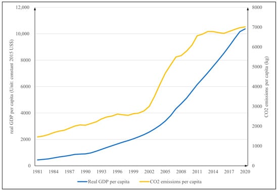 Trend of per capita GDP and CO2 emissions from 1981 to 2020 in China.