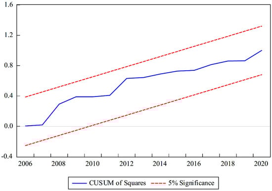 In order to examine the stability of the ARDL model, this paper performs Normality test [60], Correlation LM test [61,62], ARCH test [63], and Ramsey RESET test [64] on the residuals to assess their normality, correlation, heteroskedasticity, and functional form, respectively. The results of the tests with a probability greater than 5% indicate that the ARDL model established is stable. Additionally, the stability test proposed by Brown et al. [65] based on the cumulative sum of recursive residuals (CUSUM) and the cumulative sum of squares of recursive residuals (CUSUMSQ) is employed to examine the long-term stability of the parameter estimates. If the statistics of CUSUM and CUSUMSQ are within the significance boundary of 5%, it implies that all the parameters estimated from the regression are stable, and the null hypothesis of stability cannot be rejected [53].