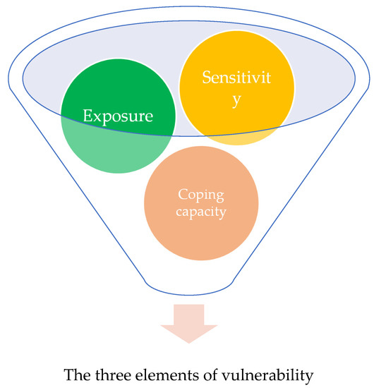 - The definition and identification of the concept of “vulnerability” includes common terms such as “exposure”, “sensitivity” and “adaptive capacity“ [19,20,21]; the “exposure” of the research subject to external disturbances, the “sensitivity” of the research subject to external disturbances and the “adaptive capacity” of the research subject have become important components (Figure 1) of the concept of vulnerability [9,22,23,24].