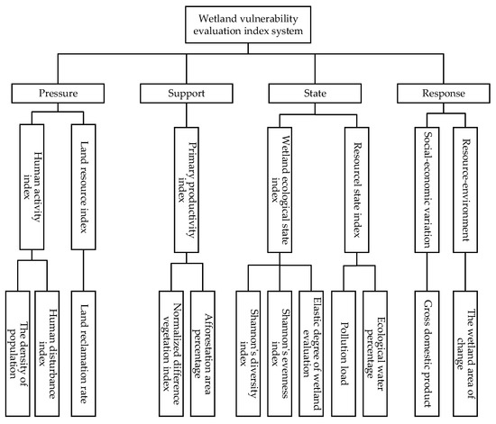 Zhang et al. [46] constructed an innovative “pressure-support-state-response” indicator system (Figure 2) to evaluate the vulnerability of wetland ecosystems in the Yellow River region. Dang et al. [47] constructed a coastal zone ecosystem vulnerability assessment system with three levels and 23 indicators from the perspectives of exposure, sensitivity and adaptive capacity.