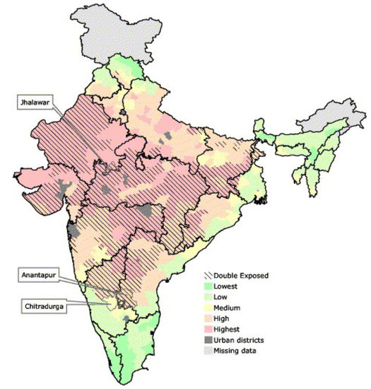 Distribution of vulnerability to the dual exposure to climate change and globalization in India [74].