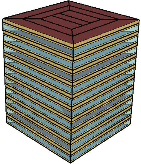 For the present study, a building with 10 floors and a 35 × 35 m quadratic plant is shown in Figure 1 and Figure 2. The core and the elevator hall are located in the centre of the floor, and the office areas are located at the perimeter, which is maintained at 24 °C. The floor has a height of 2.8 m plus a plenum of 1.15 m, totalling 3.95 m.