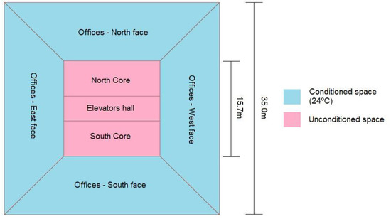 A medium/high occupation density is adopted according to the standard NBR 16401 [20], which considers a 9.3 m2 workplace and an equipment power density of 16.2 W/m2. The light power density follows [8], which determines 10.50 W/m2 for offices, 7.1 W/m2 for corridors, and 7.42 W/m2 for the core (adopting the distribution of 30% for restrooms, 30% for stairs, 20% for technical areas and 20% for lift and technical shafts). The operation schedule used in the simulation follows the office building operation described in [21].