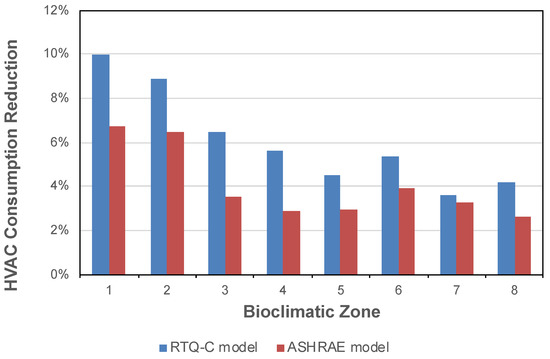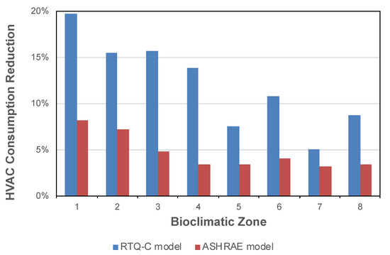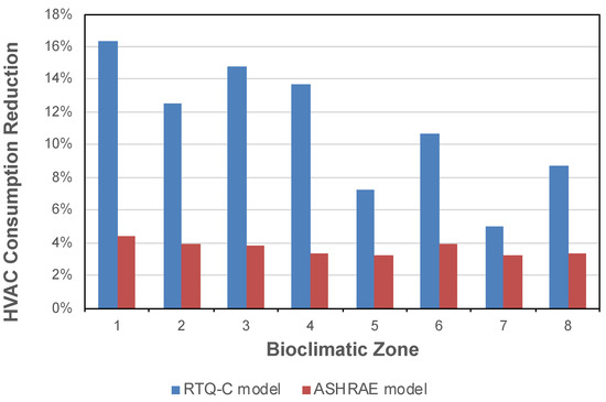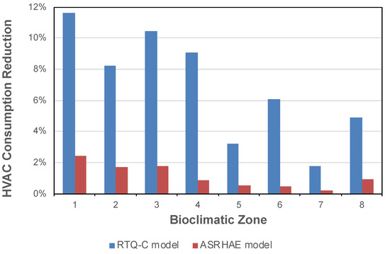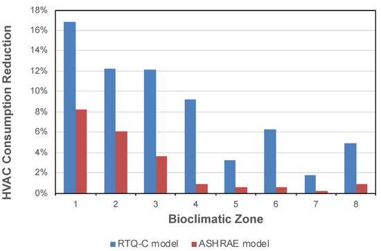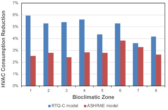 Finally, when analyzing the reduction in consumption with the three integrated models (Figure 12), the results vary in relation to the RTQ-C model between −5.03% and −19.68%, and in relation to the ASHRAE model between −3.22% and −8.21%. The highest reductions are for zones 1 to 3, due to the interaction with the Tas control.