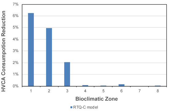 Taking into account the result for the isolated Tas control (Figure 8), only zones 1 to 3 have a reduction in energy consumption in relation to the RTQ-C model, with the highest reduction (−6.26%) for cold weather (zone 1) and the lowest for zone 3 (−2.04%). For the other zones (4 to 8), there is no significant reduction in consumption, which indicates that the gains may be related to colder weather.