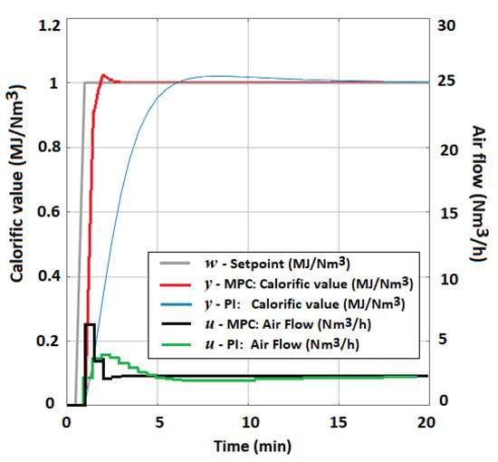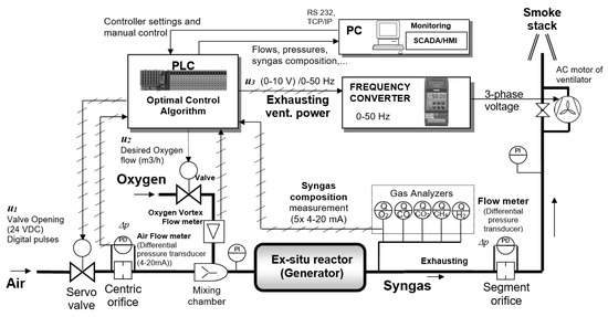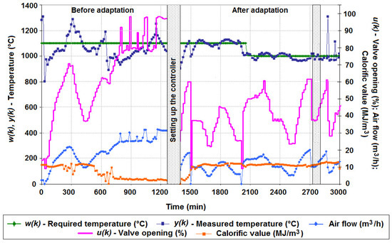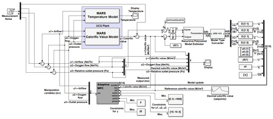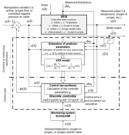 The geo-reactor changes over time, and there is a need to continually improve the control and to adapt the controller to changes in the system. Kačur et al. [28,71] proposed an adaptive control system for the stabilization of temperature and oxygen concentration in syngas based on a discrete PID controller (see Figure 2). The proposed control system can also be used to stabilize the syngas calorific value.