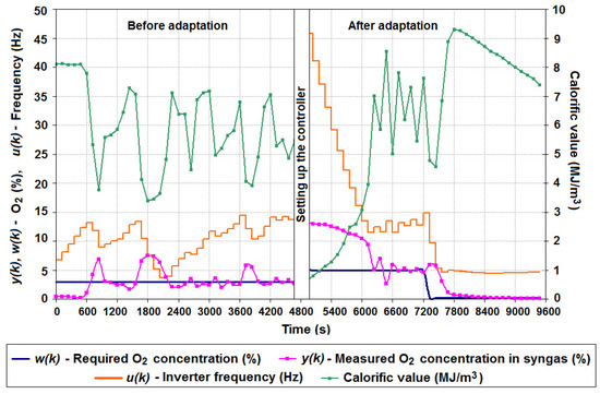 Figure 6 shows the course of continuously reduced oxygen concentration in syngas by the adaptive controller, and the corresponding syngas calorific value for a long time. From the point of view of the control goal, it is necessary to maintain the oxygen concentration at close to zero.