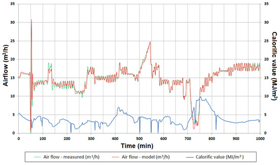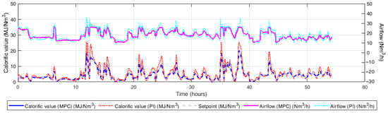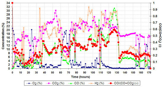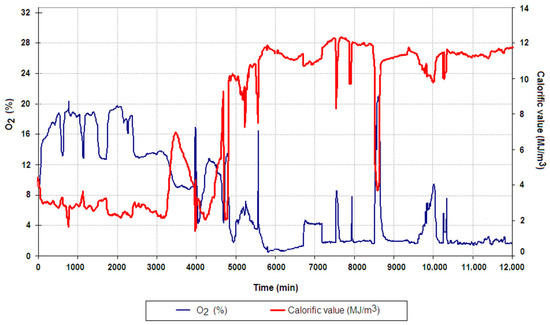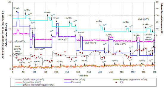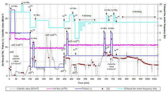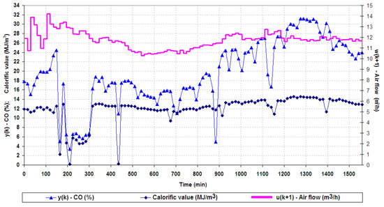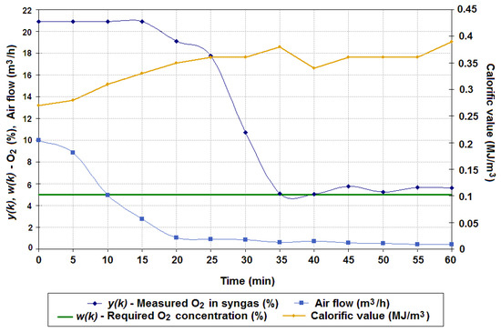Figure 16 shows the result of ESC with three manipulation variables during 10 h, where the increasing heating value of syngas from 4.4 to 8 MJ/m can be observed. This behavior was obtained by decreasing airflow, increasing oxygen added to the mixture, and reducing the power of the exhaust ventilator [25,31,67,68,80].