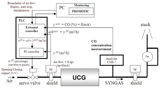 At the stabilization level of the control, in addition to calorific value and temperature, it is also necessary to maintain a low concentration of oxygen in the syngas. Control algorithms are usually tested through simulation and on laboratory ex situ reactors. For example, the control techniques on stabilization level for UCG based on discrete controllers were studied in [28]. Another example can be the simple computer feedback control with the process monitoring of the ex situ UCG reactor presented in [29]. Adaptive control can adapt the controller properties to changing operating conditions (e.g., a change in operating mode, most often in the form of a change in the pressure conditions).