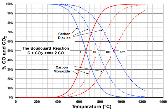 The gases CO and CO are products of the gasification process. Increasing the temperature increases the production of CO, and the effective activation energy decreases. Therefore, the CO/(CO + CO) ratio is also an important indicator during gasification. Considering the Boudouard reaction, carbon monoxide (CO) dominates in high temperatures (see Figure 9).
