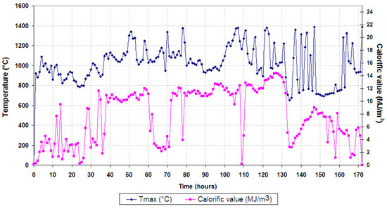 Figure 10 shows the behavior of the highest measured temperature, and the calculated calorific value from the gas composition. The behavior that is shown is from the whole experiment. The figure shows that the lower calorific value (1–9 MJ/m) dominates at lower temperatures (700–1000 C). However, the higher calorific value (9–14 MJ/m) also occurs at a higher temperature (i.e., 1000–1400 C).